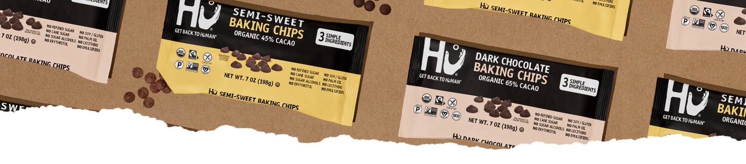 For baking, snacking, and beyond! Discover all the possibilities with Hu chocolate baking chips, made with just 3 simple ingredients. Dare we say they’re even more delicious than the chocolate chips we loved as kids? With Hu Dark Chocolate Baking Chips made with 65% cacao and Hu Semi-Sweet Chocolate Baking Chips made with 45% cacao, you’ll be left wondering how simple tastes this good. Plus, they’re Certified Organic and Fairtrade!