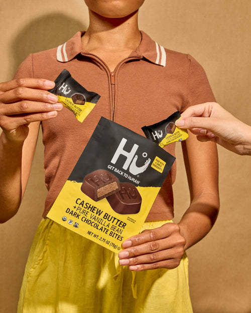 The best kind of treat is the one that fits in your pocket. Each individually wrapped Bite is filled with creamy cashew butter, hazelnut butter, or coconut and coated with rich Hu dark chocolate for an even more indulgent “bite.” Simple never tasted this good.